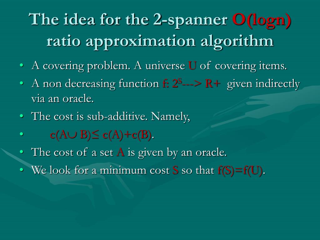 The idea for the 2-spanner O(logn) ratio approximation algorithm • A covering problem. A universe U of covering items. • A non decreasing function f: 2S---> R+ given indirectly via an oracle. • The cost is sub-additive. Namely, • c(A B)≤ c(A)+c(B). • The cost of a set A is given by an oracle. • We look for a minimum cost S so that f(S)=f(U).