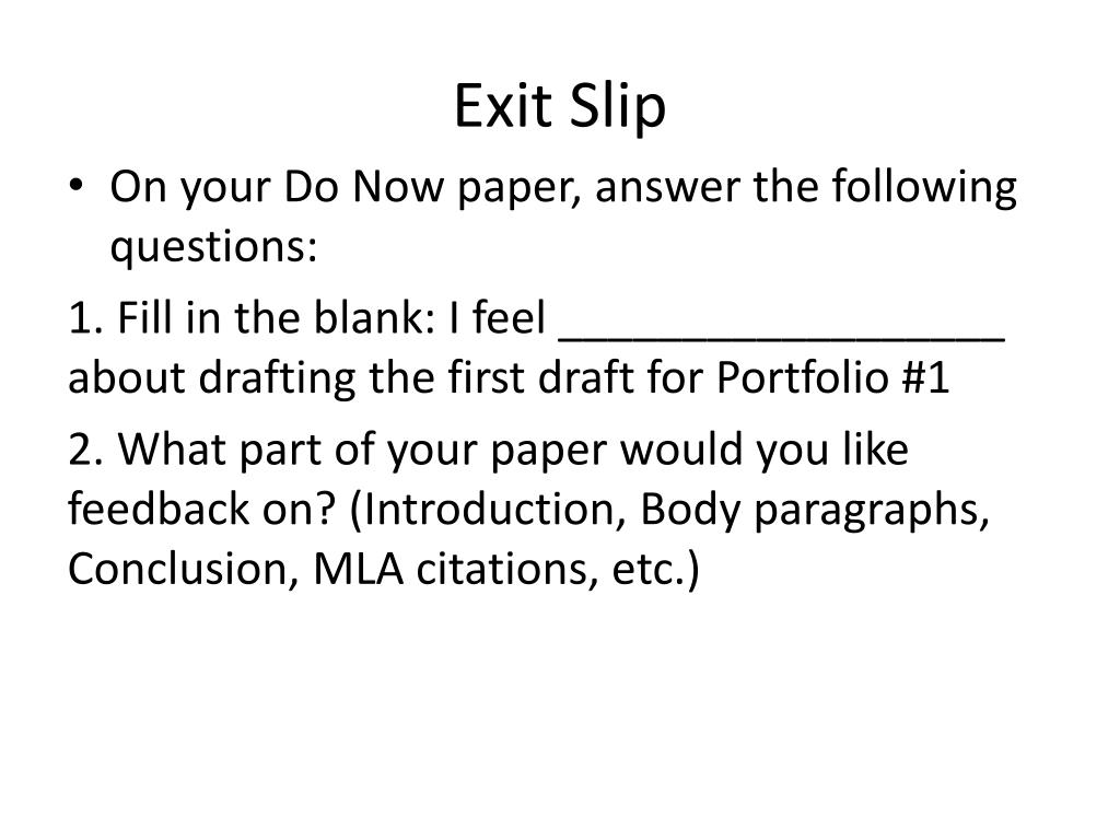 Exit Slip • On your Do Now paper, answer the following questions: 1. Fill in the blank: I feel __________________ about drafting the first draft for Portfolio #1 2. What part of your paper would you like feedback on? (Introduction, Body paragraphs, Conclusion, MLA citations, etc.)