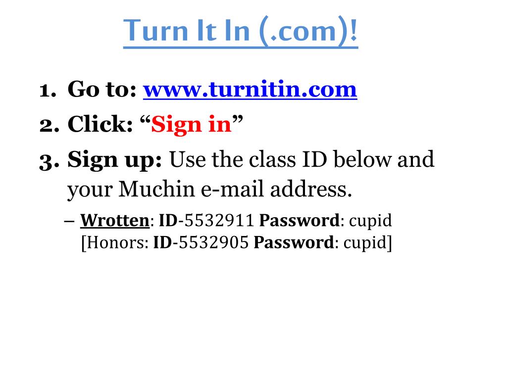 Turn It In (.com)! Go to: www.turnitin.com Click: “Sign in” Sign up: Use the class ID below and your Muchin e-mail address. Wrotten: ID-5532911 Password: cupid [Honors: ID-5532905 Password: cupid]