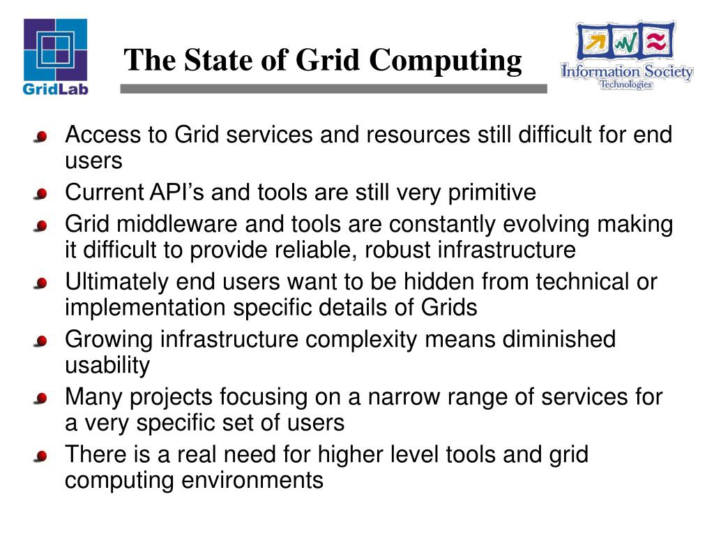 The State of Grid Computing • Access to Grid services and resources still difficult for end users • Current API’s and tools are still very primitive • Grid middleware and tools are constantly evolving making it difficult to provide reliable, robust infrastructure • Ultimately end users want to be hidden from technical or implementation specific details of Grids • Growing infrastructure complexity means diminished usability • Many projects focusing on a narrow range of services for a very specific set of users • There is a real need for higher level tools and grid computing environments