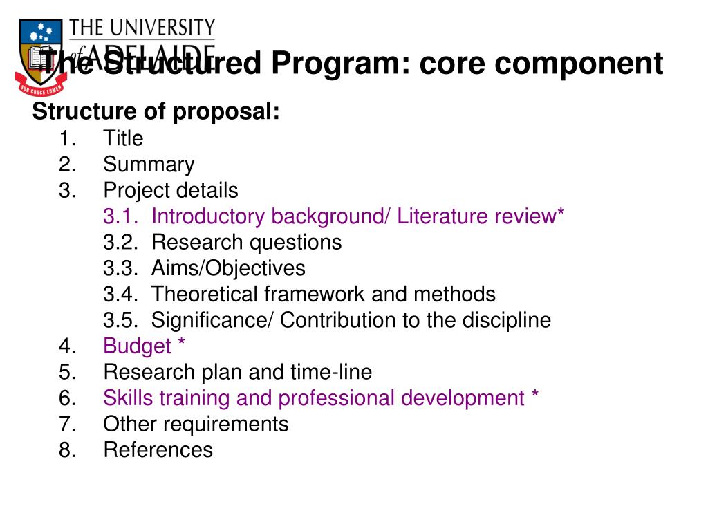 The Structured Program: core component Structure of proposal: 1. Title 2. Summary 3. Project details 3.1. Introductory background/ Literature review* 3.2. Research questions 3.3. Aims/Objectives 3.4. Theoretical framework and methods 3.5. Significance/ Contribution to the discipline 4. Budget * 5. Research plan and time-line 6.Skills training and professional development * 7. Other requirements 8. References