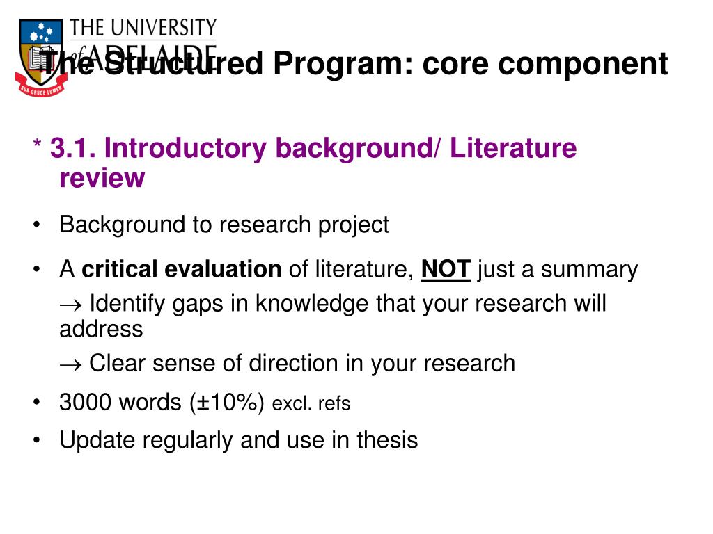 The Structured Program: core component * 3.1. Introductory background/ Literature review • Background to research project • A critical evaluation of literature, NOT just a summary Identify gaps in knowledge that your research will address Clear sense of direction in your research • 3000 words (±10%) excl. refs • Update regularly and use in thesis