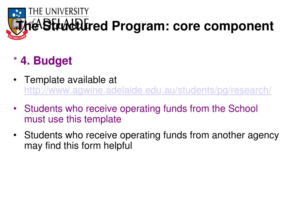 The Structured Program: core component * 4. Budget • Template available at http://www.agwine.adelaide.edu.au/students/pg/research/ • Students who receive operating funds from the School must use this template • Students who receive operating funds from another agency may find this form helpful