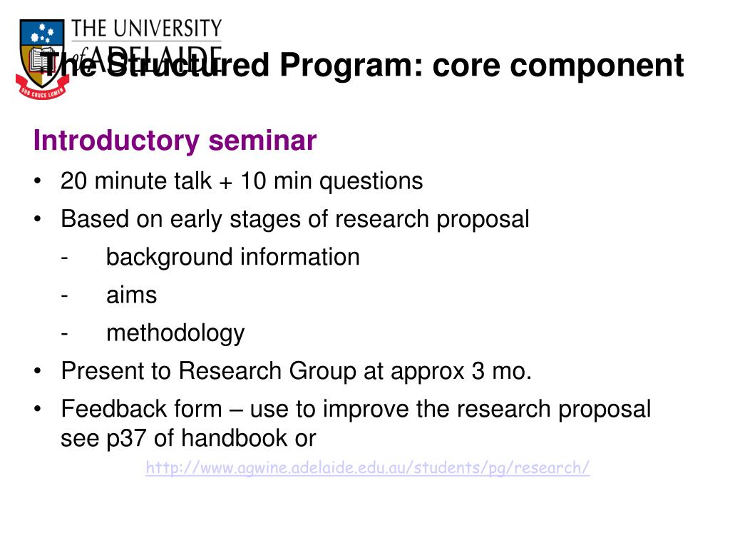 The Structured Program: core component Introductory seminar • 20 minute talk + 10 min questions • Based on early stages of research proposal - background information - aims - methodology • Present to Research Group at approx 3 mo. • Feedback form – use to improve the research proposal see p37 of handbook or http://www.agwine.adelaide.edu.au/students/pg/research/