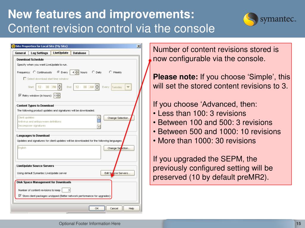 New features and improvements: Content revision control via the console • Number of content revisions stored is now configurable via the console. • Please note: If you choose ‘Simple’, this will set the stored content revisions to 3. • If you choose ‘Advanced, then: • Less than 100: 3 revisions • Between 100 and 500: 3 revisions • Between 500 and 1000: 10 revisions • More than 1000: 30 revisions • If you upgraded the SEPM, the previously configured setting will be preserved (10 by default preMR2).