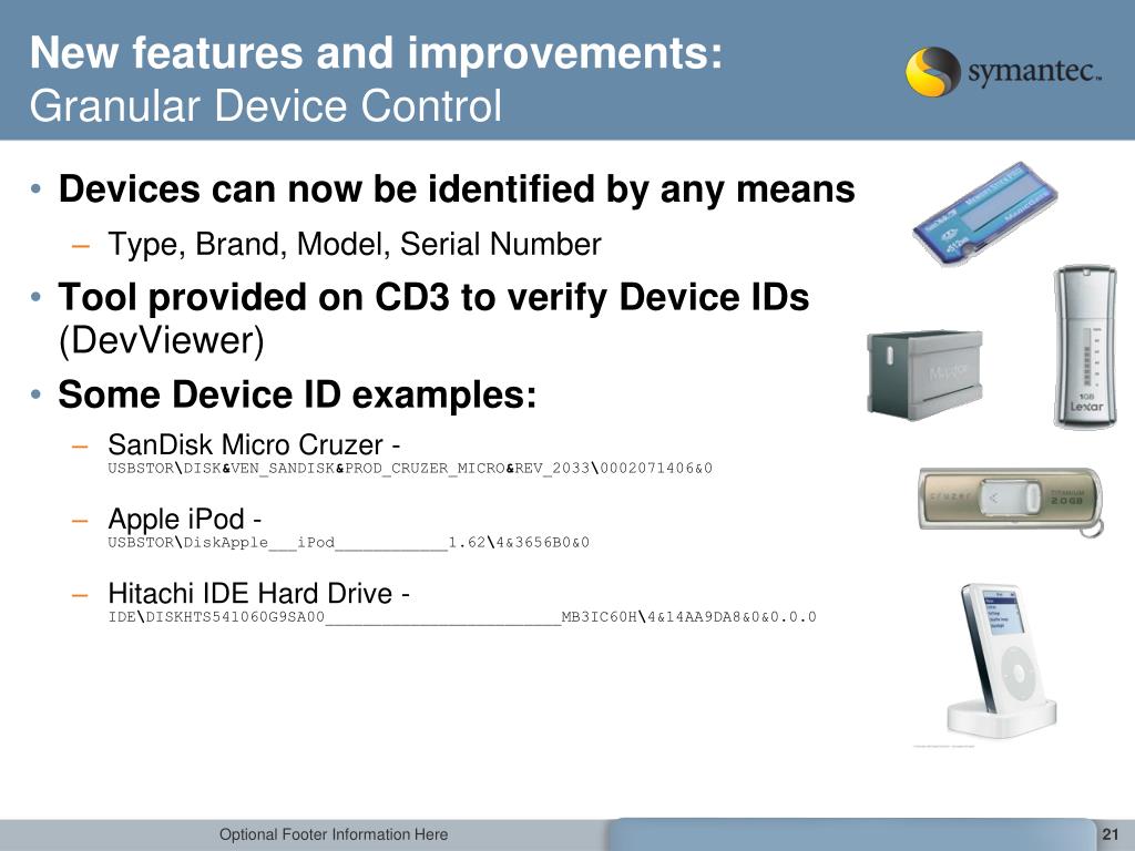 New features and improvements: Granular Device Control • Devices can now be identified by any means • Type, Brand, Model, Serial Number • Tool provided on CD3 to verify Device IDs (DevViewer) • Some Device ID examples: • SanDisk Micro Cruzer - USBSTOR\DISK&VEN_SANDISK&PROD_CRUZER_MICRO&REV_2033\0002071406&0 • Apple iPod - USBSTOR\DiskApple___iPod____________1.62\4&3656B0&0 • Hitachi IDE Hard Drive - IDE\DISKHTS541060G9SA00_________________________MB3IC60H\4&14AA9DA8&0&0.0.0