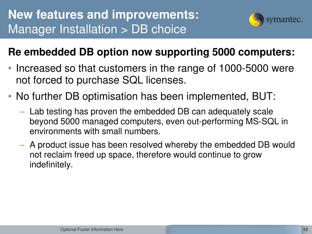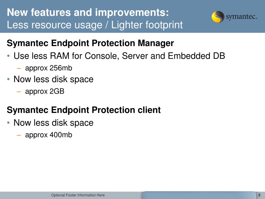 New features and improvements:Less resource usage / Lighter footprint Symantec Endpoint Protection Manager • Use less RAM for Console, Server and Embedded DB • approx 256mb • Now less disk space • approx 2GB Symantec Endpoint Protection client • Now less disk space • approx 400mb