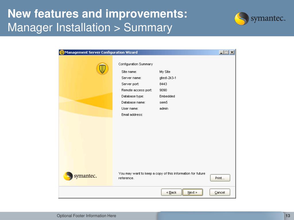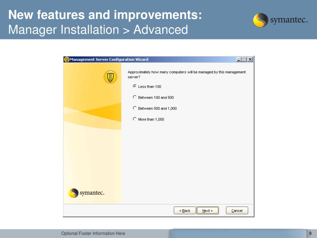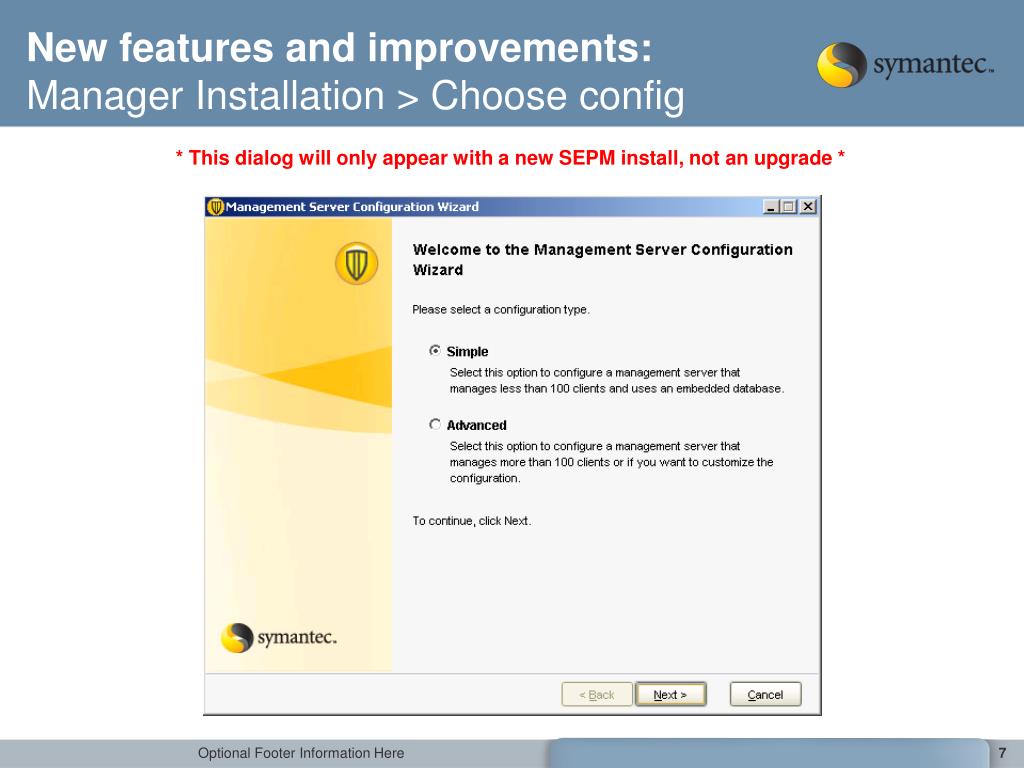 New features and improvements: Manager Installation > Choose config * This dialog will only appear with a new SEPM install, not an upgrade *