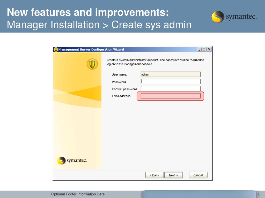 New features and improvements: More responsive console experience * Not installed by default, optional component on CD3 * • The IIS 6.0 FastCGI extension improves the performance of the Home, Monitors, and Reports pages of the console. • Is standard component to ship with Windows 2008. • Documentation also provided on CD3 detailing setup steps. • Symantec provides full support for the SEPM with the successful installation of the FastCGI extension.