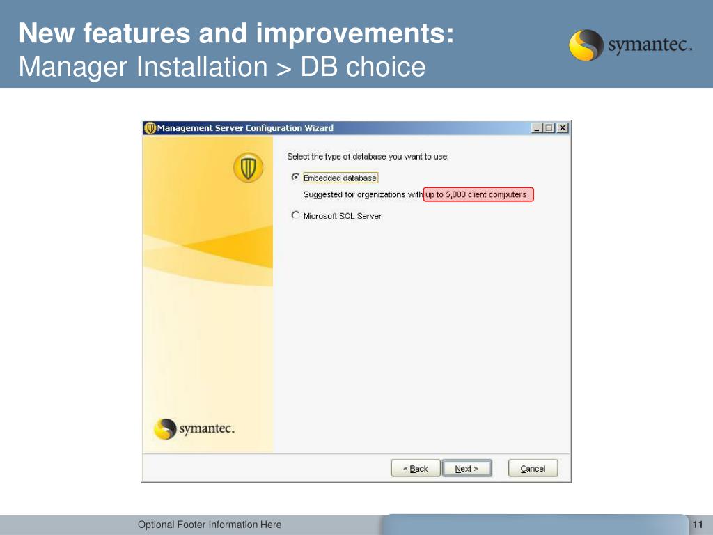 New features and improvements: Automatic AV/Antispyware exclusions • SEP 11.0, when released, already set automatic exclusions for MS Exchange 2003 and 2007. • Now, MR2 will add automatic exclusions for: • SEPM embedded database and transactional logs • Active Directory database, transactional logs and working files • Following Microsoft best practice recommendations