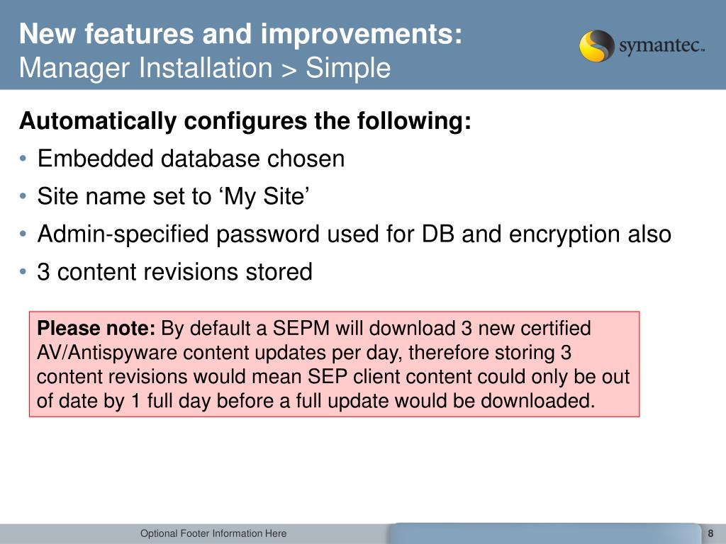 New features and improvements: Manager Installation > Simple Automatically configures the following: • Embedded database chosen • Site name set to ‘My Site’ • Admin-specified password used for DB and encryption also • 3 content revisions stored Please note: By default a SEPM will download 3 new certified AV/Antispyware content updates per day, therefore storing 3 content revisions would mean SEP client content could only be out of date by 1 full day before a full update would be downloaded.