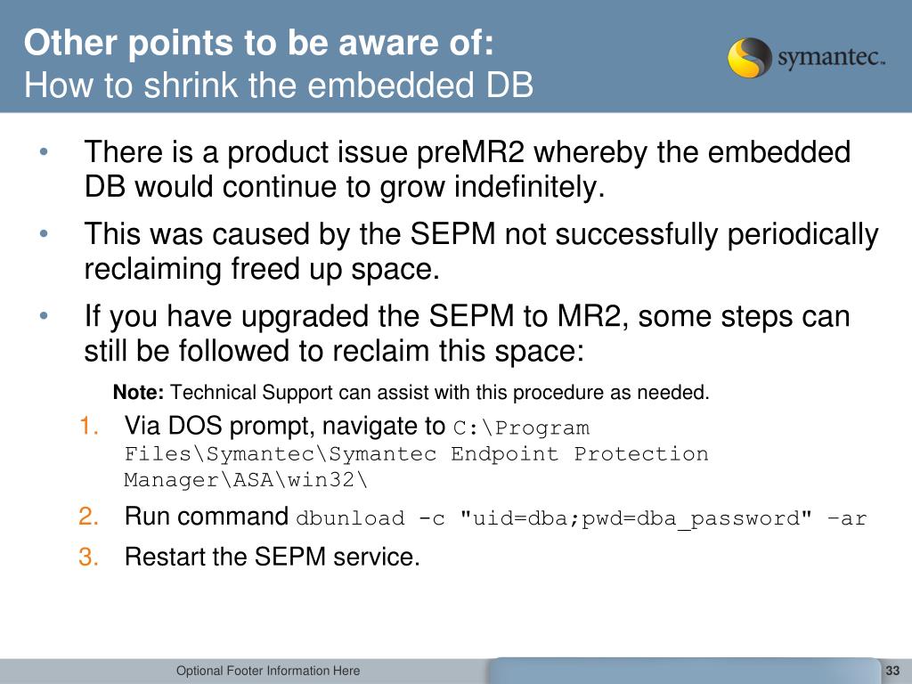 Other points to be aware of:How to shrink the embedded DB • There is a product issue preMR2 whereby the embedded DB would continue to grow indefinitely. • This was caused by the SEPM not successfully periodically reclaiming freed up space. • If you have upgraded the SEPM to MR2, some steps can still be followed to reclaim this space: Note: Technical Support can assist with this procedure as needed. • Via DOS prompt, navigate to C:\Program Files\Symantec\Symantec Endpoint Protection Manager\ASA\win32\ • Run command dbunload -c "uid=dba;pwd=dba_password" –ar • Restart the SEPM service.