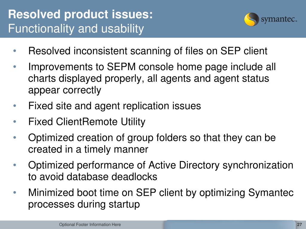 Resolved product issues: Functionality and usability • Resolved inconsistent scanning of files on SEP client • Improvements to SEPM console home page include all charts displayed properly, all agents and agent status appear correctly • Fixed site and agent replication issues • Fixed ClientRemote Utility • Optimized creation of group folders so that they can be created in a timely manner • Optimized performance of Active Directory synchronization to avoid database deadlocks • Minimized boot time on SEP client by optimizing Symantec processes during startup