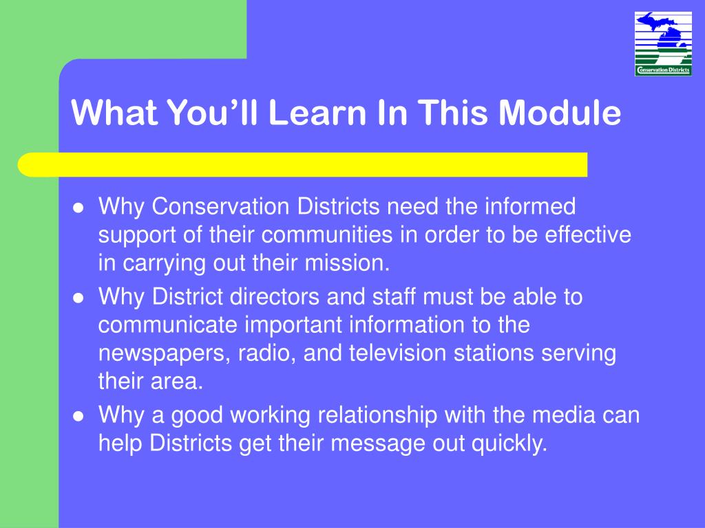 Media Relations. Training Module 13. & Outreach. What You’ll Learn In This Module. Why Conservation Districts need the informed support of their communities in order to be effective in carrying out their mission.