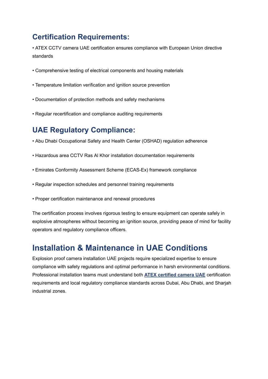 Certification Requirements: • ATEX CCTV camera UAE certification ensures compliance with European Union directive standards • Comprehensive testing of electrical components and housing materials • Temperature limitation verification and ignition source prevention • Documentation of protection methods and safety mechanisms • Regular recertification and compliance auditing requirements UAE Regulatory Compliance: • Abu Dhabi Occupational Safety and Health Center (OSHAD) regulation adherence • Hazardous area CCTV Ras Al Khor installation documentation requirements • Emirates Conformity Assessment Scheme (ECAS-Ex) framework compliance • Regular inspection schedules and personnel training requirements • Proper certification maintenance and renewal procedures The certification process involves rigorous testing to ensure equipment can operate safely in explosive atmospheres without becoming an ignition source, providing peace of mind for facility operators and regulatory compliance officers. Installation & Maintenance in UAE Conditions Explosion proof camera installation UAE projects require specialized expertise to ensure compliance with safety regulations and optimal performance in harsh environmental conditions. Professional installation teams must understand both ATEX certified camera UAE certification requirements and local regulatory compliance standards across Dubai, Abu Dhabi, and Sharjah industrial zones.