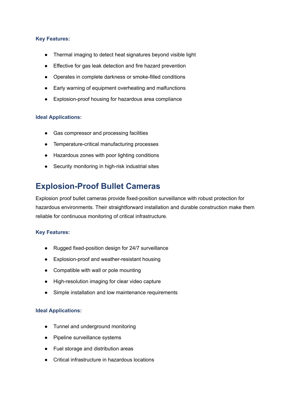 Key Features: ● Thermal imaging to detect heat signatures beyond visible light ● Effective for gas leak detection and fire hazard prevention ● Operates in complete darkness or smoke-filled conditions ● Early warning of equipment overheating and malfunctions ● Explosion-proof housing for hazardous area compliance Ideal Applications: ● Gas compressor and processing facilities ● Temperature-critical manufacturing processes ● Hazardous zones with poor lighting conditions ● Security monitoring in high-risk industrial sites Explosion-Proof Bullet Cameras Explosion proof bullet cameras provide fixed-position surveillance with robust protection for hazardous environments. Their straightforward installation and durable construction make them reliable for continuous monitoring of critical infrastructure. Key Features: ● Rugged fixed-position design for 24/7 surveillance ● Explosion-proof and weather-resistant housing ● Compatible with wall or pole mounting ● High-resolution imaging for clear video capture ● Simple installation and low maintenance requirements Ideal Applications: ● Tunnel and underground monitoring ● Pipeline surveillance systems ● Fuel storage and distribution areas ● Critical infrastructure in hazardous locations