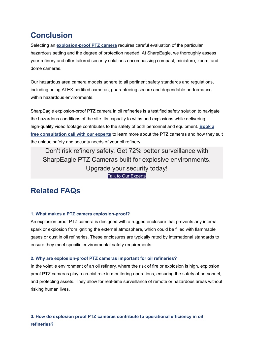 Conclusion Selecting an explosion-proof PTZ camera requires careful evaluation of the particular hazardous setting and the degree of protection needed. At SharpEagle, we thoroughly assess your refinery and offer tailored security solutions encompassing compact, miniature, zoom, and dome cameras. Our hazardous area camera models adhere to all pertinent safety standards and regulations, including being ATEX-certified cameras, guaranteeing secure and dependable performance within hazardous environments. SharpEagle explosion-proof PTZ camera in oil refineries is a testified safety solution to navigate the hazardous conditions of the site. Its capacity to withstand explosions while delivering high-quality video footage contributes to the safety of both personnel and equipment. Book a free consultation call with our experts to learn more about the PTZ cameras and how they suit the unique safety and security needs of your oil refinery. Don’t risk refinery safety. Get 72% better surveillance with SharpEagle PTZ Cameras built for explosive environments. Upgrade your security today! Talk to Our Experts Related FAQs 1. What makes a PTZ camera explosion-proof? An explosion proof PTZ camera is designed with a rugged enclosure that prevents any internal spark or explosion from igniting the external atmosphere, which could be filled with flammable gases or dust in oil refineries. These enclosures are typically rated by international standards to ensure they meet specific environmental safety requirements. 2. Why are explosion-proof PTZ cameras important for oil refineries? In the volatile environment of an oil refinery, where the risk of fire or explosion is high, explosion proof PTZ cameras play a crucial role in monitoring operations, ensuring the safety of personnel, and protecting assets. They allow for real-time surveillance of remote or hazardous areas without risking human lives. 3. How do explosion proof PTZ cameras contribute to operational efficiency in oil refineries?