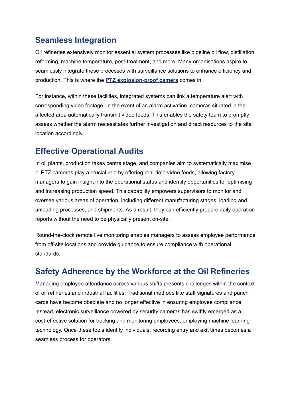 Seamless Integration Oil refineries extensively monitor essential system processes like pipeline oil flow, distillation, reforming, machine temperature, post-treatment, and more. Many organisations aspire to seamlessly integrate these processes with surveillance solutions to enhance efficiency and production. This is where the PTZ explosion-proof camera comes in. For instance, within these facilities, integrated systems can link a temperature alert with corresponding video footage. In the event of an alarm activation, cameras situated in the affected area automatically transmit video feeds. This enables the safety team to promptly assess whether the alarm necessitates further investigation and direct resources to the site location accordingly. Effective Operational Audits In oil plants, production takes centre stage, and companies aim to systematically maximise it. PTZ cameras play a crucial role by offering real-time video feeds, allowing factory managers to gain insight into the operational status and identify opportunities for optimising and increasing production speed. This capability empowers supervisors to monitor and oversee various areas of operation, including different manufacturing stages, loading and unloading processes, and shipments. As a result, they can efficiently prepare daily operation reports without the need to be physically present on-site. Round-the-clock remote live monitoring enables managers to assess employee performance from off-site locations and provide guidance to ensure compliance with operational standards. Safety Adherence by the Workforce at the Oil Refineries Managing employee attendance across various shifts presents challenges within the context of oil refineries and industrial facilities. Traditional methods like staff signatures and punch cards have become obsolete and no longer effective in ensuring employee compliance. Instead, electronic surveillance powered by security cameras has swiftly emerged as a cost-effective solution for tracking and monitoring employees, employing machine learning technology. Once these tools identify individuals, recording entry and exit times becomes a seamless process for operators.