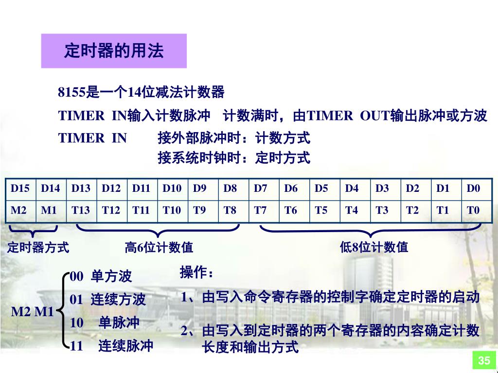 定时器的用法 8155是一个14位减法计数器 TIMER IN输入计数脉冲 计数满时,由TIMER OUT输出脉冲或方波 TIMER IN 接外部脉冲时:计数方式 接系统时钟时:定时方式 低8位计数值 定时器方式 高6位计数值 • 00 单方波 • 01 连续方波 • 单脉冲 • 连续脉冲 操作: 1、由写入命令寄存器的控制字确定定时器的启动 M2 M1 2、由写入到定时器的两个寄存器的内容确定计数 长度和输出方式