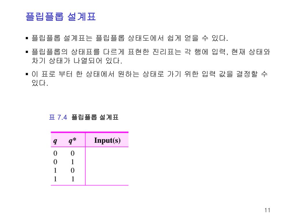 플립플롭 설계표 • 플립플롭 설계표는 플립플롭 상태도에서 쉽게 얻을 수 있다. • 플립플롭의 상태표를 다르게 표현한 진리표는 각 행에 입력, 현재 상태와 차기 상태가 나열되어 있다. • 이 표로 부터 한 상태에서 원하는 상태로 가기 위한 입력 값을 결정할 수 있다. 표 7.4 플립플롭 설계표