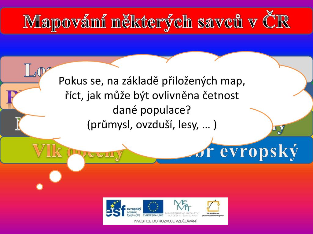 Mapování některých savců v ČR Pokus se, na základě přiložených map, říct, jak může být ovlivněna četnost dané populace? (průmysl, ovzduší, lesy, … ) Los evropský Muflon Rys ostrovid Mýval severní Netopýr velký Sysel obecný Vlk obecný Bobr evropský