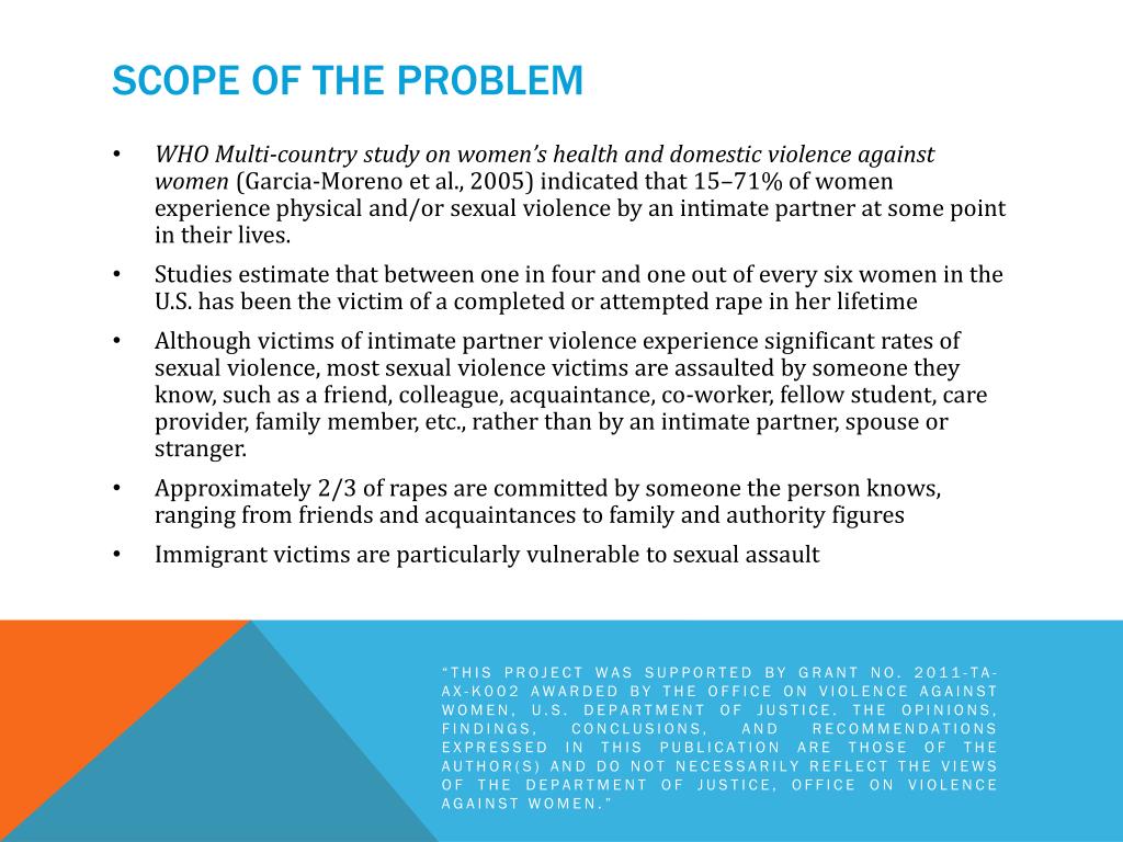 Scope of the problem • WHO Multi-country study on women’s health and domestic violence against women (Garcia-Moreno et al., 2005) indicated that 15–71% of women experience physical and/or sexual violence by an intimate partner at some point in their lives. • Studies estimate that between one in four and one out of every six women in the U.S. has been the victim of a completed or attempted rape in her lifetime • Although victims of intimate partner violence experience significant rates of sexual violence, most sexual violence victims are assaulted by someone they know, such as a friend, colleague, acquaintance, co-worker, fellow student, care provider, family member, etc., rather than by an intimate partner, spouse or stranger. • Approximately 2/3 of rapes are committed by someone the person knows, ranging from friends and acquaintances to family and authority figures • Immigrant victims are particularly vulnerable to sexual assault “This project was supported by Grant No. 2011-TA-AX-K002 awarded by the Office on Violence Against Women, U.S. Department of Justice. The opinions, findings, conclusions, and recommendations expressed in this publication are those of the author(s) and do NOT necessarily reflect the views of the Department of Justice, Office on Violence Against Women.”