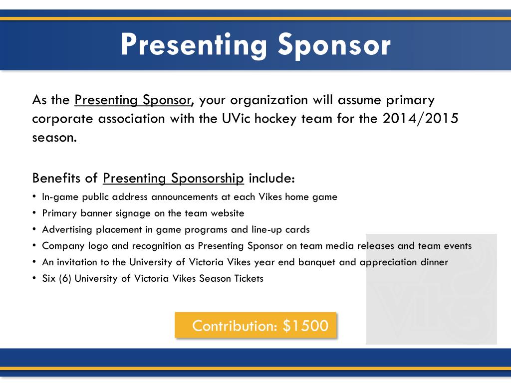 Presenting Sponsor As the Presenting Sponsor, your organization will assume primary corporate association with the UVic hockey team for the 2014/2015 season. Benefits of Presenting Sponsorship include: • In-game public address announcements at each Vikes home game • Primary banner signage on the team website • Advertising placement in game programs and line-up cards • Company logo and recognition as Presenting Sponsor on team media releases and team events • An invitation to the University of Victoria Vikes year end banquet and appreciation dinner • Six (6) University of Victoria Vikes Season Tickets Contribution: $1500