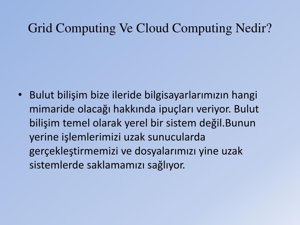 Grid Computing Ve Cloud Computing Nedir? • Bulut bilişim bize ileride bilgisayarlarımızın hangi mimaride olacağı hakkında ipuçları veriyor. Bulut bilişim temel olarak yerel bir sistem değil.Bunun yerine işlemlerimizi uzak sunucularda gerçekleştirmemizi ve dosyalarımızı yine uzak sistemlerde saklamamızı sağlıyor.