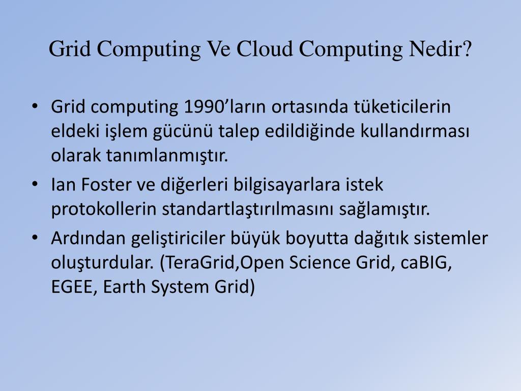 Grid Computing Ve Cloud Computing Nedir? • Grid computing 1990’ların ortasında tüketicilerin eldeki işlem gücünü talep edildiğinde kullandırması olarak tanımlanmıştır. • Ian Foster ve diğerleri bilgisayarlara istek protokollerin standartlaştırılmasını sağlamıştır. • Ardından geliştiriciler büyük boyutta dağıtık sistemler oluşturdular. (TeraGrid,OpenScience Grid, caBIG, EGEE, Earth System Grid)