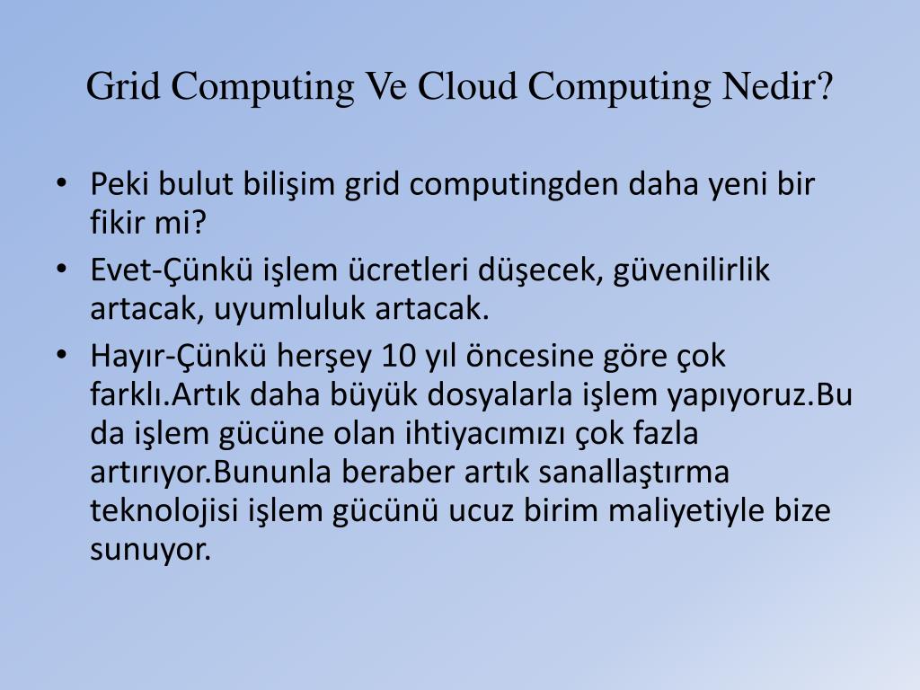 Grid Computing Ve Cloud Computing Nedir? • Peki bulut bilişim grid computingden daha yeni bir fikir mi? • Evet-Çünkü işlem ücretleri düşecek, güvenilirlik artacak, uyumluluk artacak. • Hayır-Çünkü herşey 10 yıl öncesine göre çok farklı.Artık daha büyük dosyalarla işlem yapıyoruz.Bu da işlem gücüne olan ihtiyacımızı çok fazla artırıyor.Bununla beraber artık sanallaştırma teknolojisi işlem gücünü ucuz birim maliyetiyle bize sunuyor.