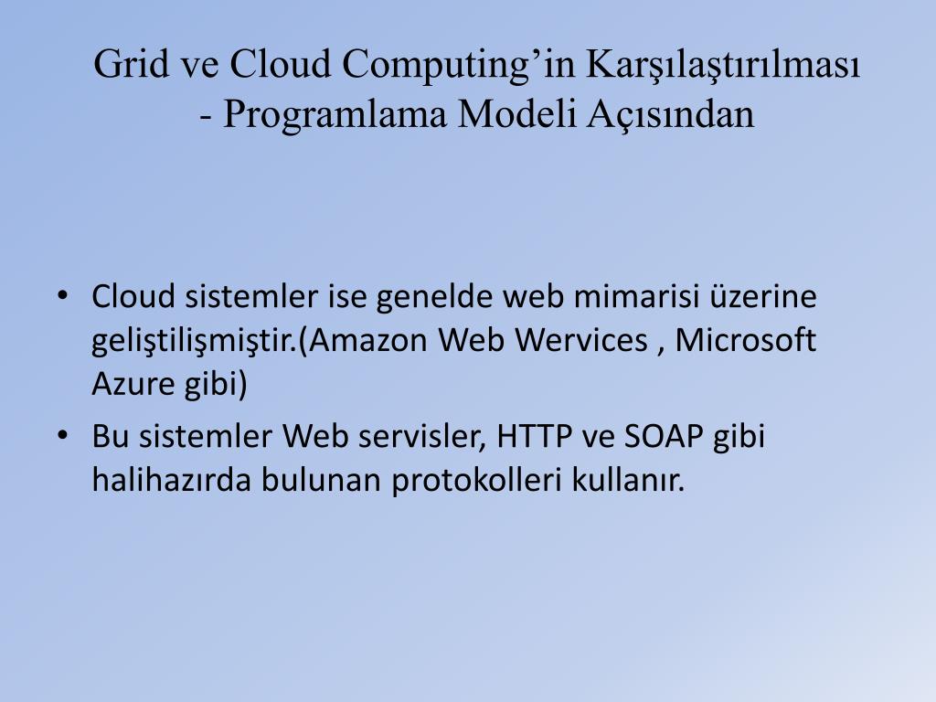 Grid ve Cloud Computing’in Karşılaştırılması- Programlama Modeli Açısından • Cloudsistemler ise genelde web mimarisi üzerine geliştilişmiştir.(Amazon Web Wervices , Microsoft Azure gibi) • Bu sistemler Web servisler, HTTP ve SOAP gibi halihazırda bulunan protokolleri kullanır.