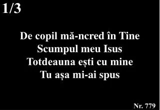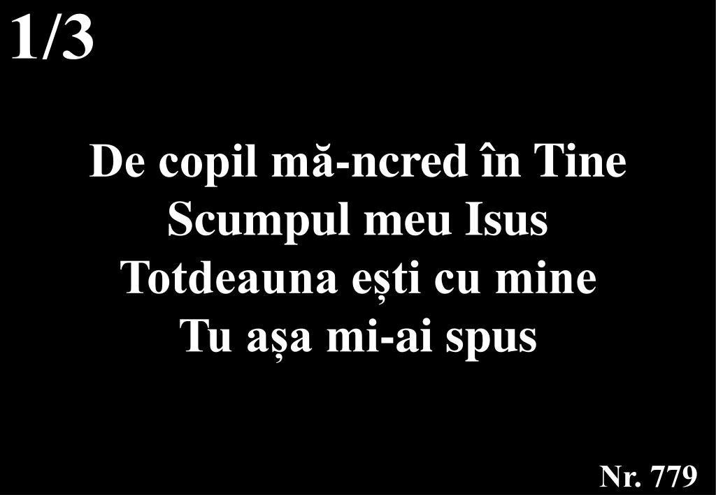 1/3. De copil mă-ncred în Tine Scumpul meu Isus Totdeauna ești cu mine Tu așa mi-ai spus. Nr. 779. Refren:. De copil Ție mă-ncred De Conducător Te-aleg Tu veghează-asupra mea Blând cu mâna Ta. Nr. 779. 2/3. De copil mă-ncred în Tine În sângele Tău Ce-ai vărsat pe lemnul crucii