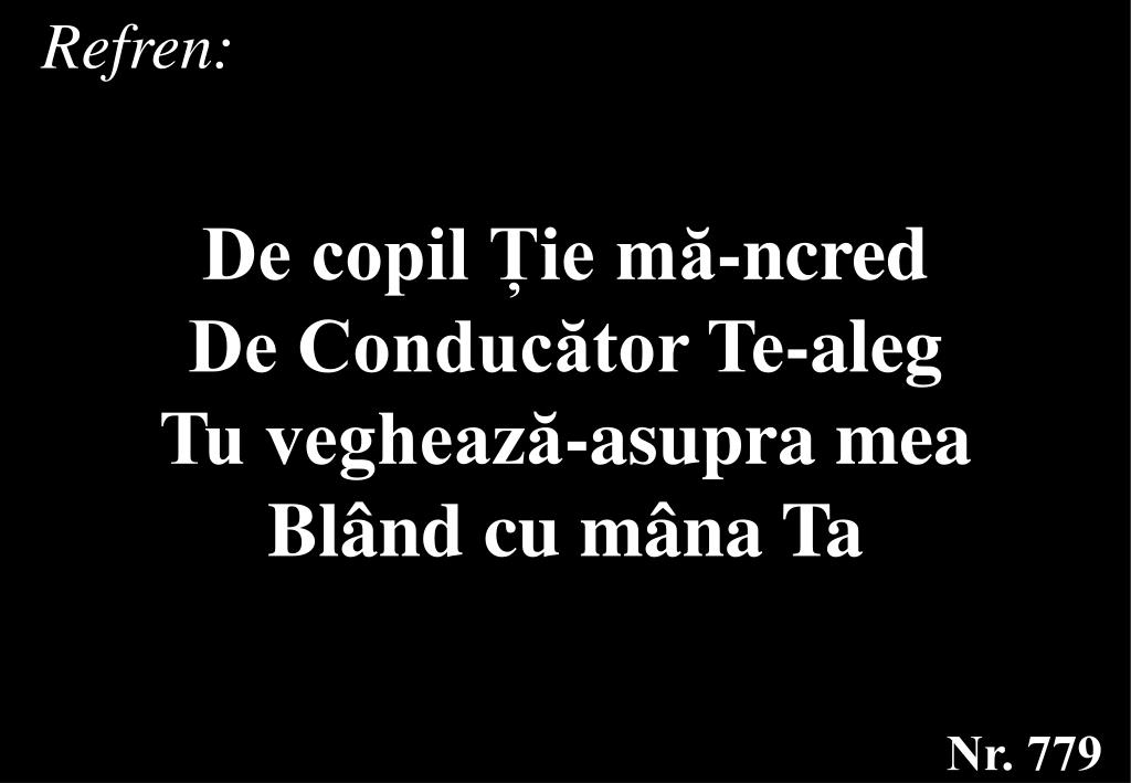 Refren: De copil Ție mă-ncred De Conducător Te-aleg Tu veghează-asupra mea Blând cu mâna Ta Nr. 779