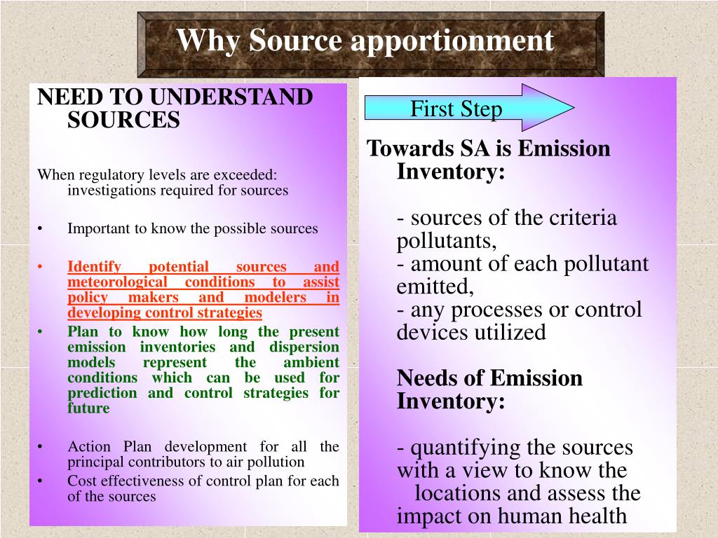 Why Source apportionment Towards SA is Emission Inventory:- sources of the criteria pollutants, - amount of each pollutant emitted, - any processes or control devices utilized Needs of Emission Inventory:- quantifying the sources with a view to know the locations and assess the impact on human health • NEED TO UNDERSTAND SOURCES • When regulatory levels are exceeded: investigations required for sources • Important to know the possible sources • Identify potential sources and meteorological conditions to assist policy makers and modelers in developing control strategies • Plan to know how long the present emission inventories and dispersion models represent the ambient conditions which can be used for prediction and control strategies for future • Action Plan development for all the principal contributors to air pollution • Cost effectiveness of control plan for each of the sources First Step