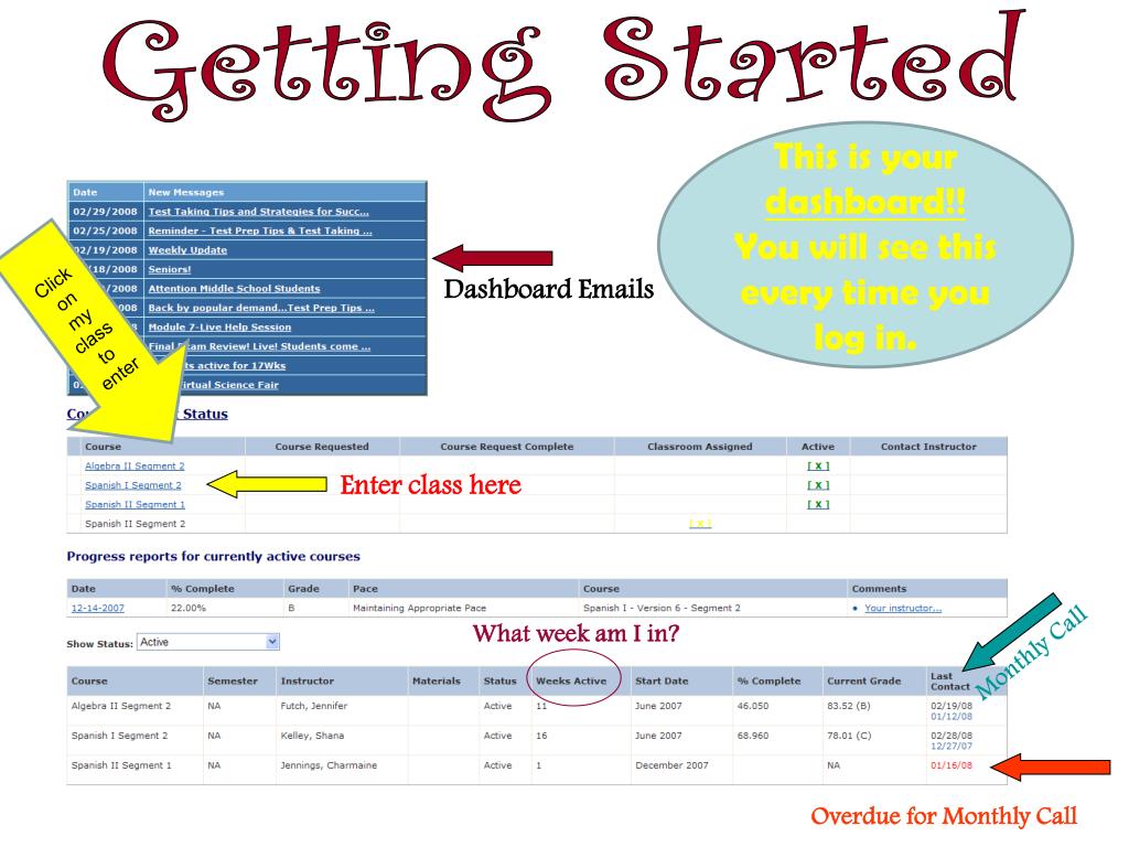 Getting Started This is your dashboard!! You will see this every time you log in. Click on my class to enter Dashboard Emails Enter class here Monthly Call What week am I in? Overduefor Monthly Call