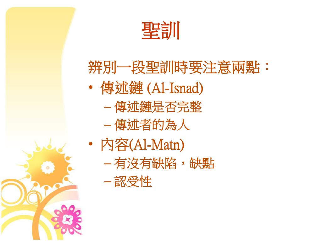 聖訓 辨別一段聖訓時要注意兩點: • 傳述鏈 (Al-Isnad) • 傳述鏈是否完整 • 傳述者的為人 • 內容(Al-Matn) • 有沒有缺陷,缺點 • 認受性