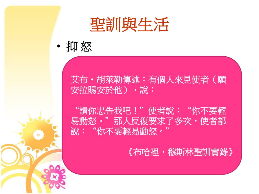 聖訓與生活 • 抑 怒 艾布•胡萊勒傳述:有個人來見使者(願安拉賜安於他),說: “請你忠告我吧!”使者說:“你不要輕易動怒。”那人反復要求了多次,使者都說:“你不要輕易動怒。” 《布哈裡,穆斯林聖訓實錄》