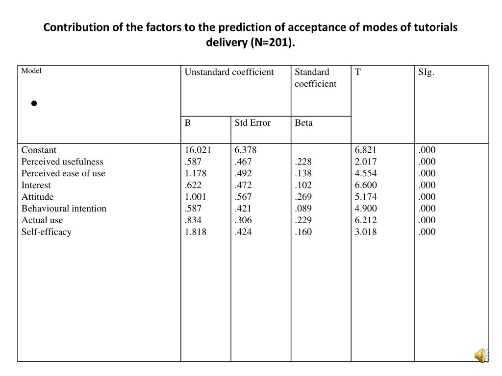 Contribution of the factors to the prediction of acceptance of modes of tutorials delivery (N=201).