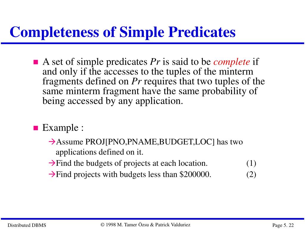 Completeness of Simple Predicates • A set of simple predicates Pr is said to be complete if and only if the accesses to the tuples of the minterm fragments defined on Pr requires that two tuples of the same minterm fragment have the same probability of being accessed by any application. • Example : • Assume PROJ[PNO,PNAME,BUDGET,LOC] has two applications defined on it. • Find the budgets of projects at each location. (1) • Find projects with budgets less than $200000. (2)