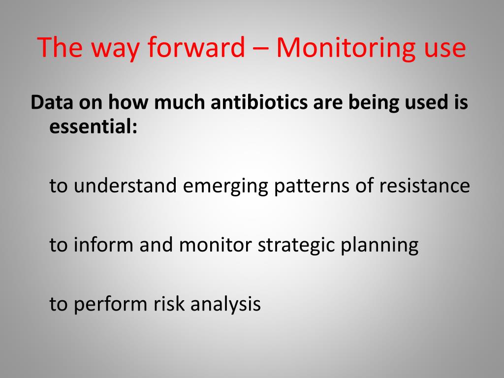 The way forward – Monitoring use Data on how much antibiotics are being used is essential: to understand emerging patterns of resistance to inform and monitor strategic planning to perform risk analysis