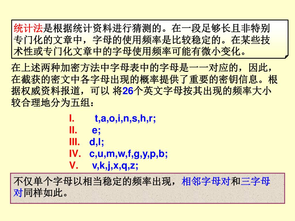 统计法是根据统计资料进行猜测的。在一段足够长且非特别专门化的文章中,字母的使用频率是比较稳定的。在某些技术性或专门化文章中的字母使用频率可能有微小变化。统计法是根据统计资料进行猜测的。在一段足够长且非特别专门化的文章中,字母的使用频率是比较稳定的。在某些技术性或专门化文章中的字母使用频率可能有微小变化。 不仅单个字母以相当稳定的频率出现,相邻字母对和三字母对同样如此。 在上述两种加密方法中字母表中的字母是一一对应的,因此,在截获的密文中各字母出现的概率提供了重要的密钥信息。根据权威资料报道,可以 将26个英文字母按其出现的频率大小较合理地分为五组: • t,a,o,i,n,s,h,r; • e; • d,l; • c,u,m,w,f,g,y,p,b; • v,k,j,x,q,z;