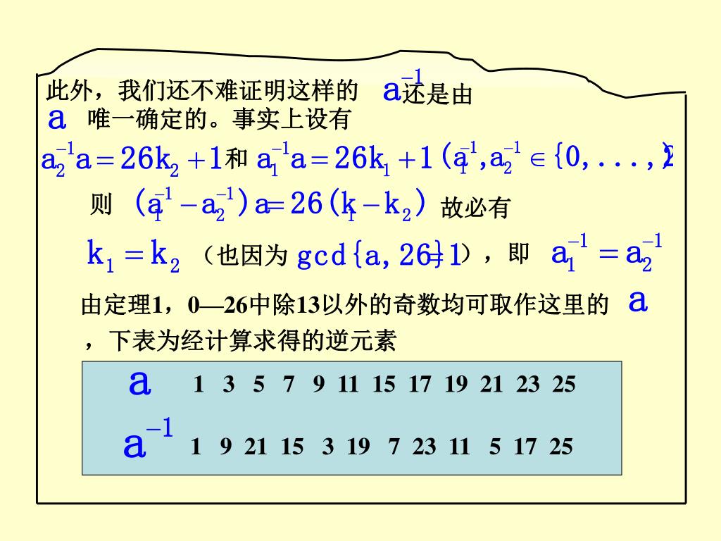 此外,我们还不难证明这样的 还是由 唯一确定的。事实上设有 和 则 故必有 ),即 (也因为 由定理1,0—26中除13以外的奇数均可取作这里的 ,下表为经计算求得的逆元素 1 3 5 7 9 11 15 17 19 21 23 25 1 9 21 15 3 19 7 23 11 5 17 25