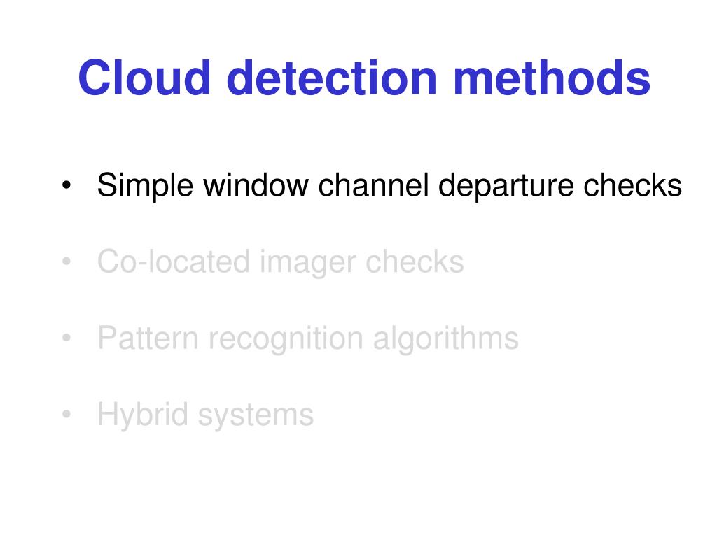 Cloud detection methods • Simple window channel departure checks • Co-located imager checks • Pattern recognition algorithms • Hybrid systems