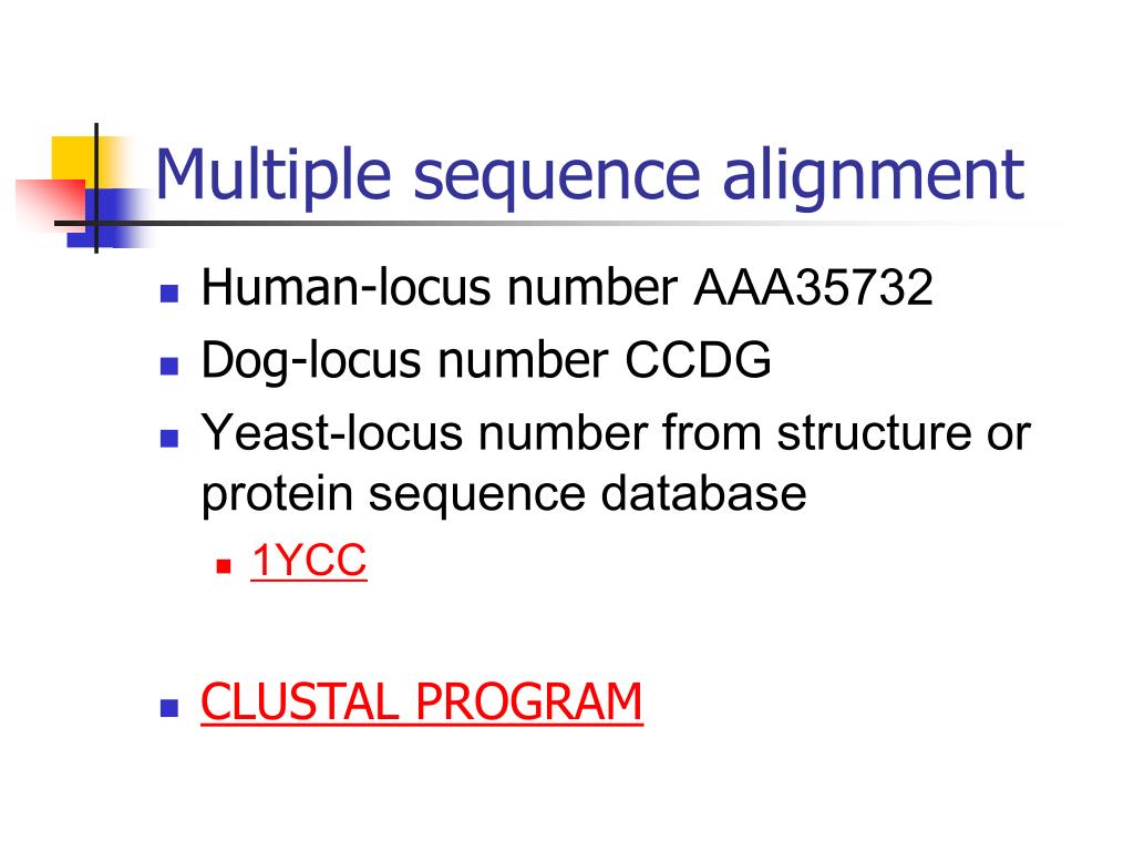 Multiple sequence alignment • Human-locus number AAA35732 • Dog-locus number CCDG • Yeast-locus number from structure or protein sequence database • 1YCC • CLUSTAL PROGRAM