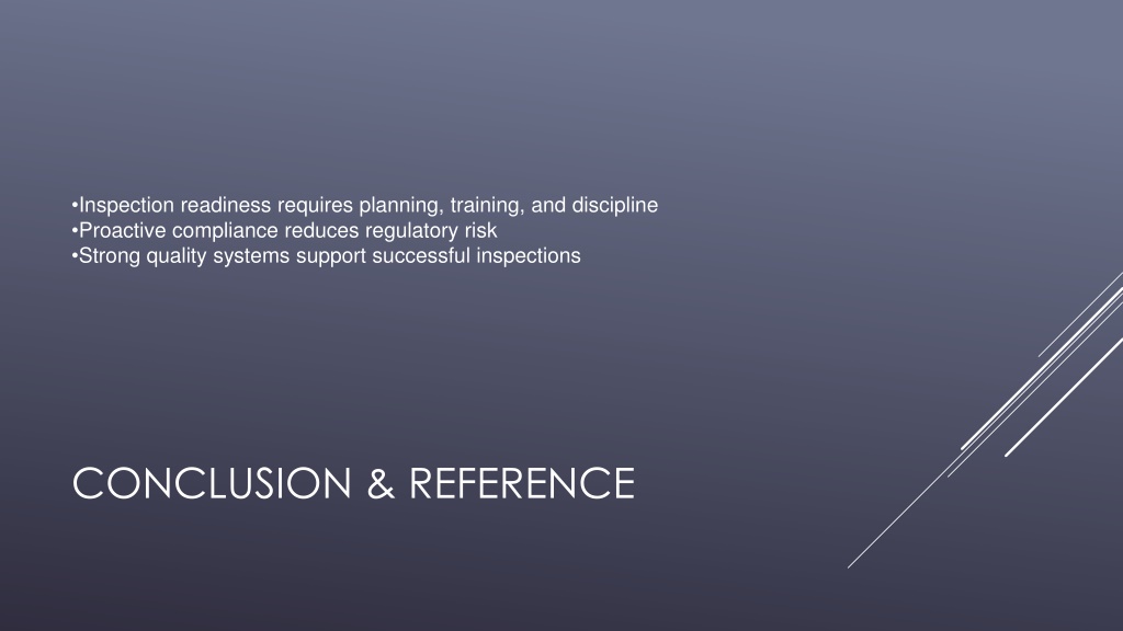 10. Inspection readiness requires planning, training, and discipline • Proactive compliance reduces regulatory risk • Strong quality systems support successful inspections Conclusion & Reference