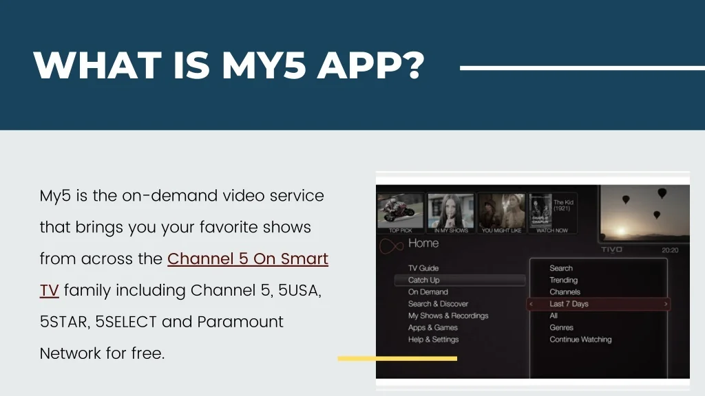 WHAT IS MY5 APP? My5 is the on-demand video service that brings you your favorite shows from across the Channel 5 On Smart TV family including Channel 5, 5USA, 5STAR, 5SELECT and Paramount Network for free.