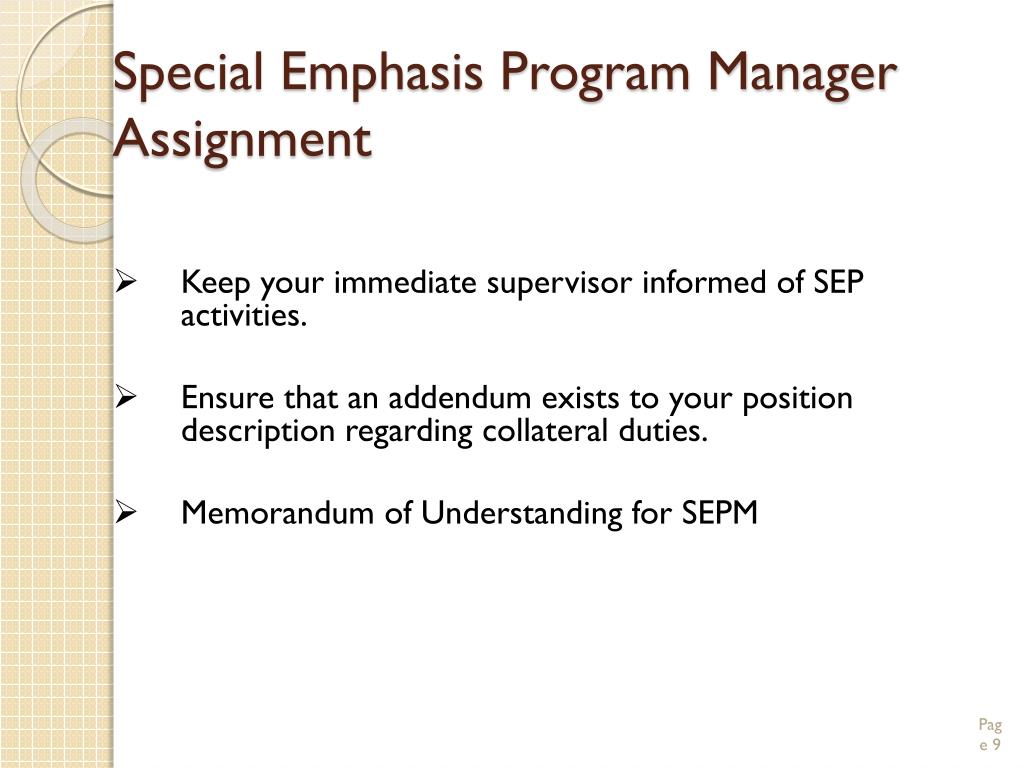 Special Emphasis Program Manager Assignment • Keep your immediate supervisor informed of SEP activities. • Ensure that an addendum exists to your position description regarding collateral duties. • Memorandum of Understanding for SEPM
