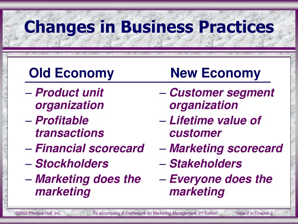 Old Economy Product unit organization Profitable transactions Financial scorecard Stockholders Marketing does the marketing New Economy Customer segment organization Lifetime value of customer Marketing scorecard Stakeholders Everyone does the marketing Changes in Business Practices To accompany A Framework for Marketing Management, 2nd Edition
