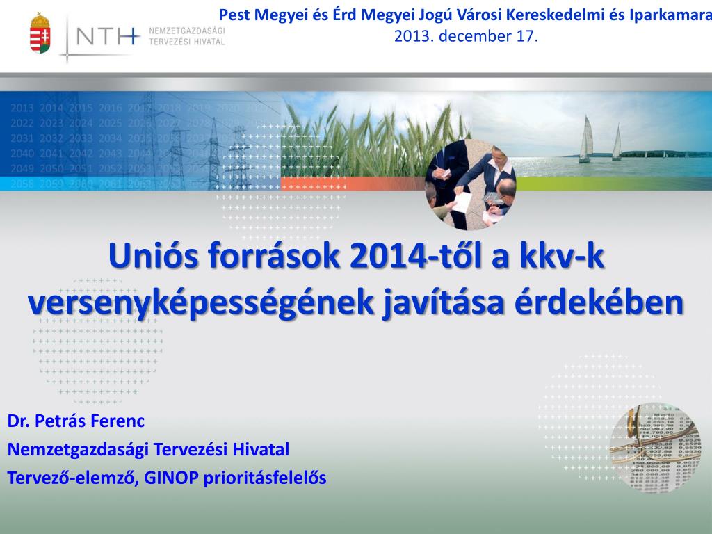 PestMegyei és Érd Megyei Jogú Városi Kereskedelmi és Iparkamara 2013. december 17. Uniós források 2014-től a kkv-k versenyképességének javítása érdekében Dr. Petrás Ferenc Nemzetgazdasági Tervezési Hivatal Tervező-elemző, GINOP prioritásfelelős