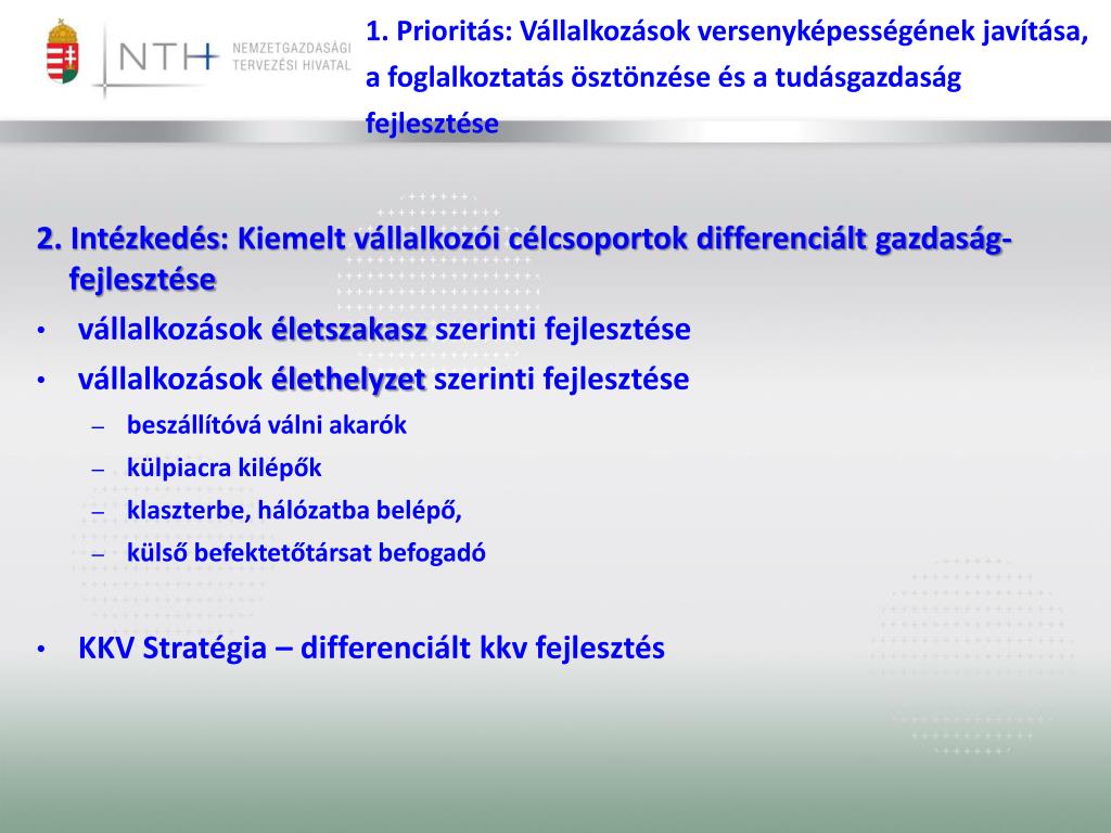 1. Prioritás: Vállalkozások versenyképességének javítása, a foglalkoztatás ösztönzése és a tudásgazdaság fejlesztése 2. Intézkedés: Kiemelt vállalkozói célcsoportok differenciált gazdaság-fejlesztése • vállalkozások életszakasz szerinti fejlesztése • vállalkozások élethelyzet szerinti fejlesztése • beszállítóvá válni akarók • külpiacra kilépők • klaszterbe, hálózatba belépő, • külső befektetőtársat befogadó • KKV Stratégia – differenciált kkv fejlesztés